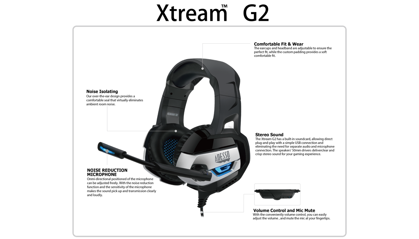 The Adesso Xtream G2 is a stereo USB gaming headset built for long sessions. It features large 50 mm drivers for immersive sound, a noise-cancelling boom mic to help you be heard clearly, and soft, breathable earcups plus an adjustable headband for comfort. With inline volume control, LED lighting, and a plug-and-play USB connection, it’s ideal for PC gamers, cloud gaming setups, and those who want a stylish, functional headset with minimal fuss.
