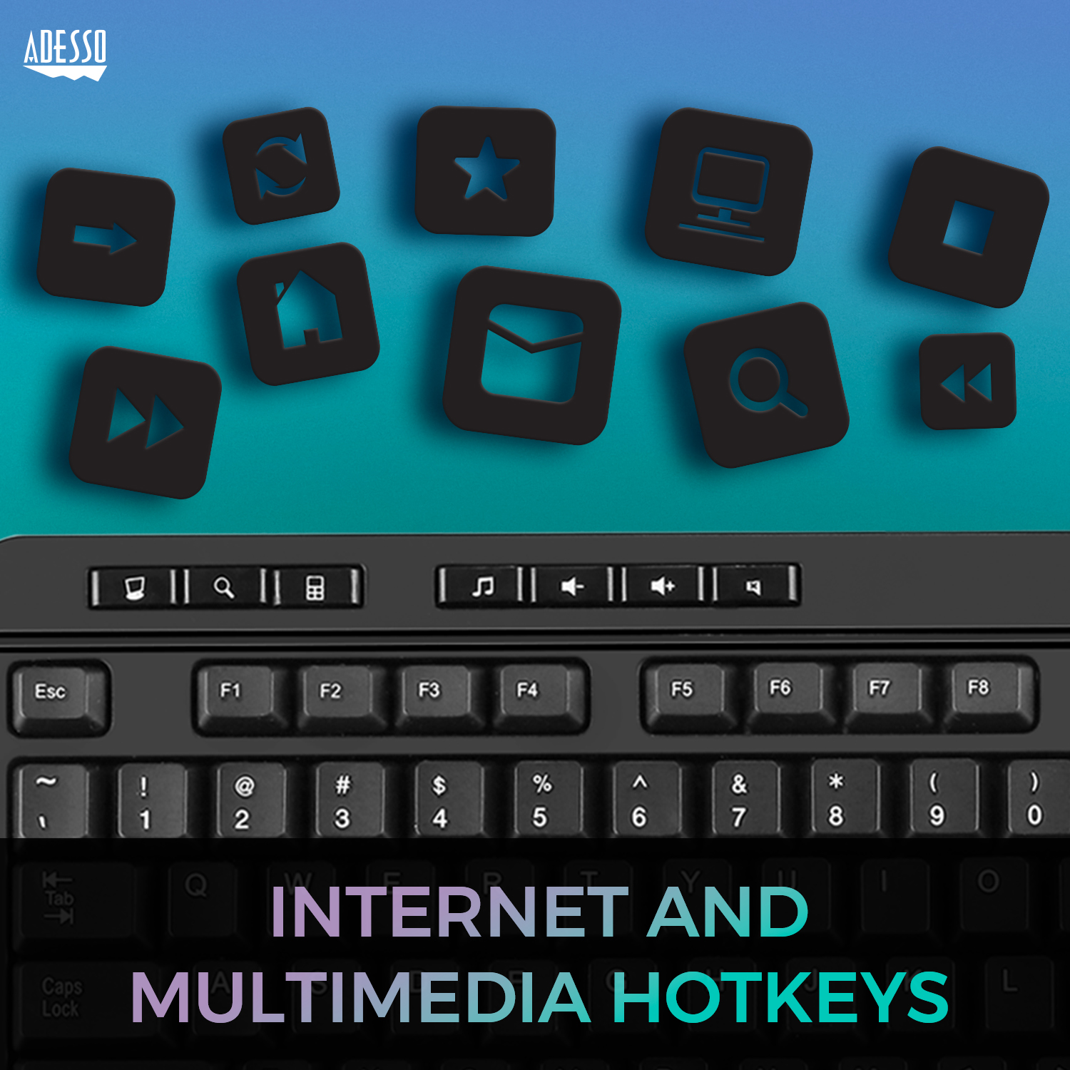 The Adesso Multimedia Desktop Keyboard (AKB-132) simplifies daily computing with 14 hotkeys for media player controls, email, Internet, and common applications. It features quiet membrane key switches for a tactile response and is available with USB or PS/2 connectors.