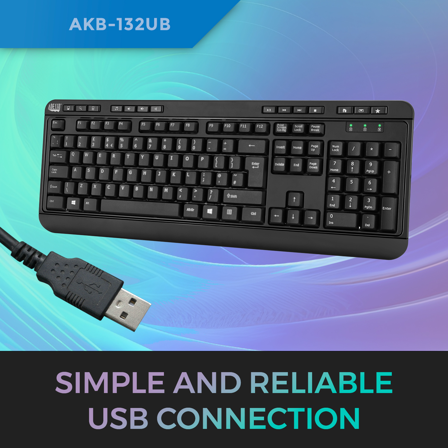 Full Size Control The Adesso AKB-132CB keyboard offers complete typing functionality with its full-size 104 key layout giving you a large numeric keypad with all the functionality you would expect in a modern desktop keyboard. |