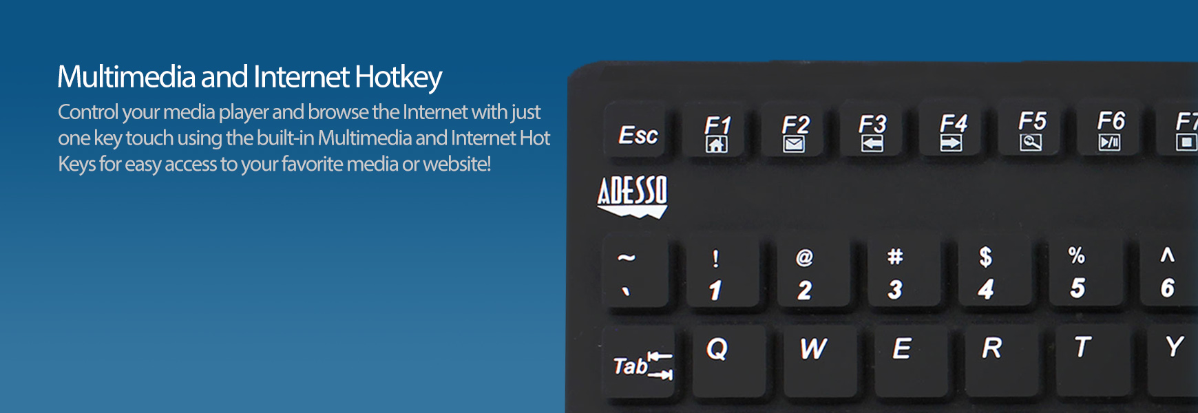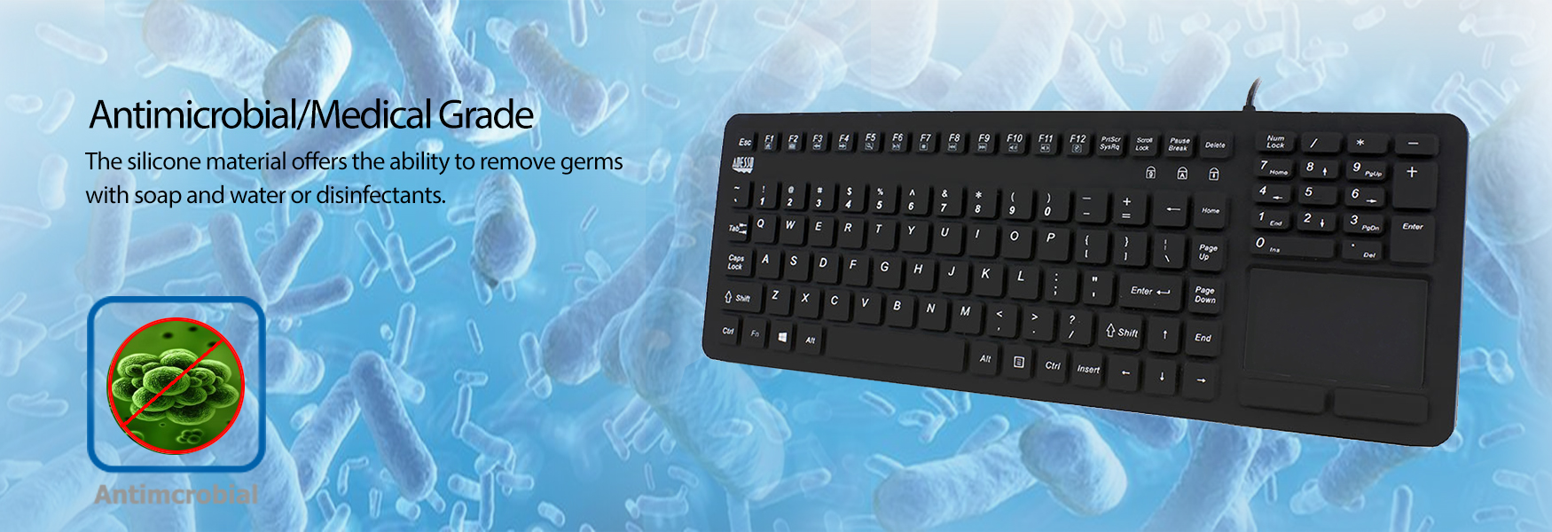 The Adesso® AKB-270UB Antimicrobial Waterproof Silicone Touchpad Keyboard is designed for high traffic applications. The keyboard is easily cleaned with soap and water. It is made with antimicrobial material that protects against germ buildups between washings. The keyboard has a USB interface that easily connects without having to install specific drivers. Aside from these incredibly practical and hygienic features, the keyboard is made for smooth and quiet performance. (Solution: Health)