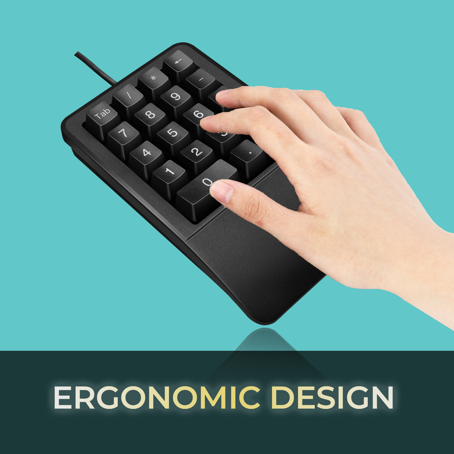 Ergonomic Design The design of this keypad with a gently sloped shape and wrist rest encourages the natural positioning of your hand, wrist, and forearm for maximum comfort every time you use it. |