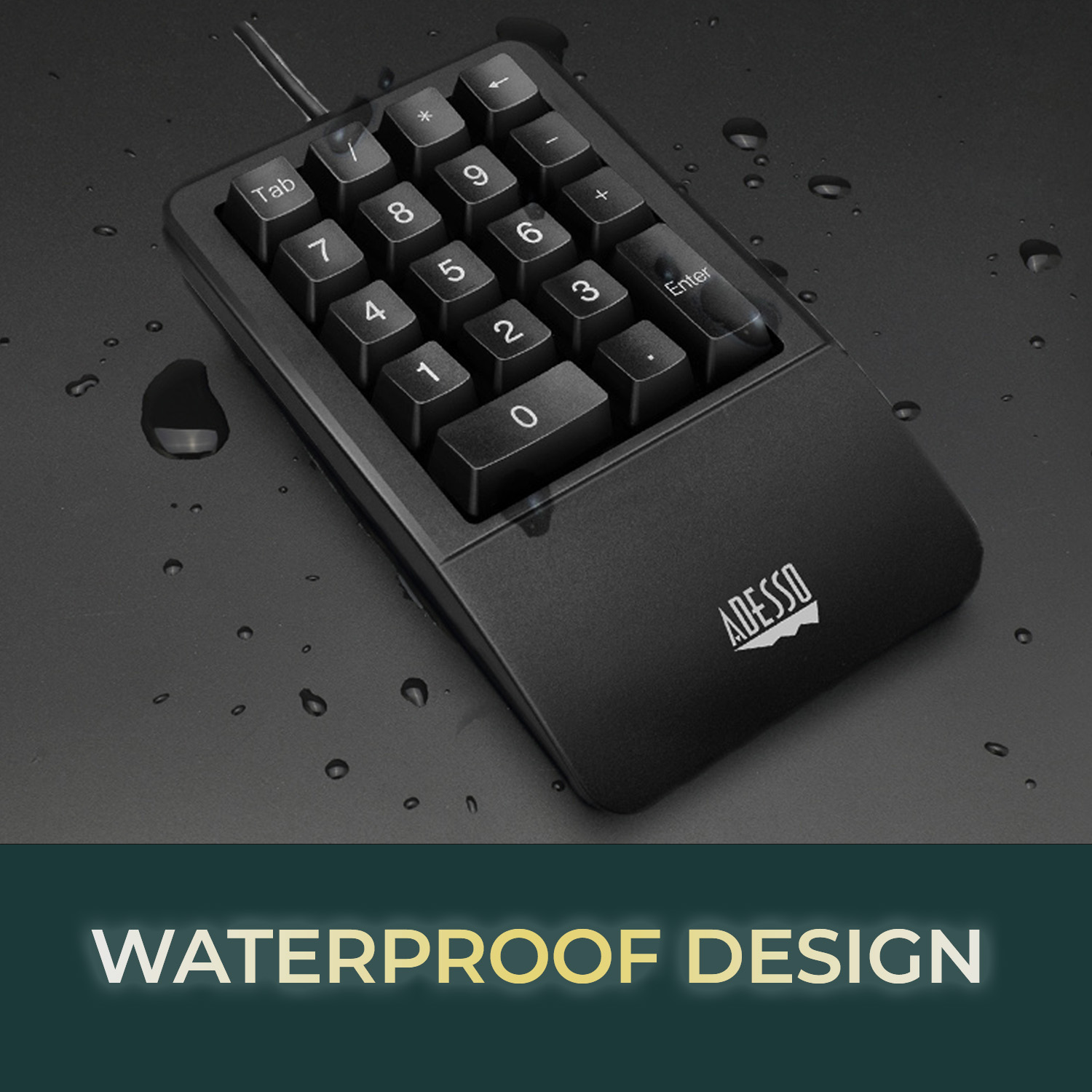 | Waterproof Design The Adesso AKB-618 keypad has a design where there are no gaps, holes, or slots so water or liquids cannot get through or seep through. Accidental spills are not damaging to the circuitry inside so you can still enjoy the keypad for years to come. |