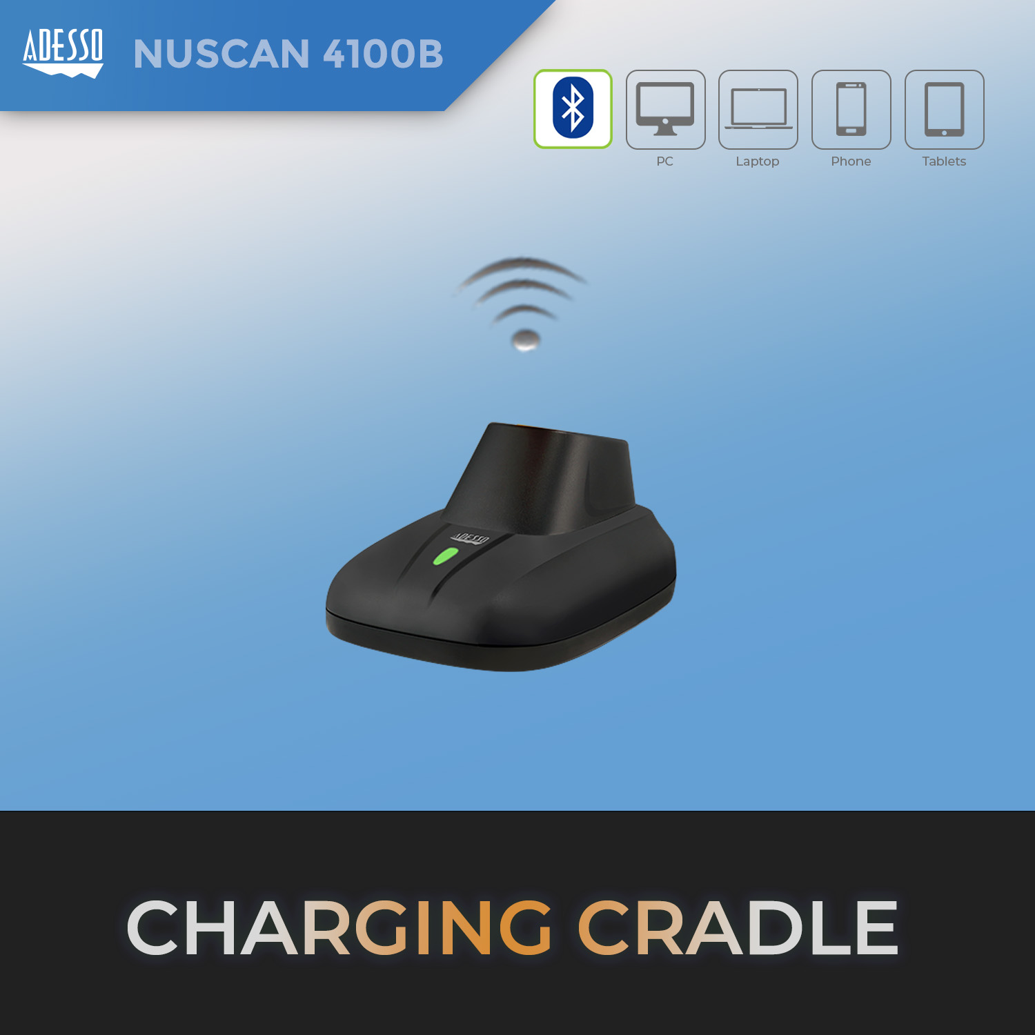 - Adesso NuScan 4100B Bluetooth® Antimicrobial Waterproof CCD Barcode Scanner with Charging Cradle