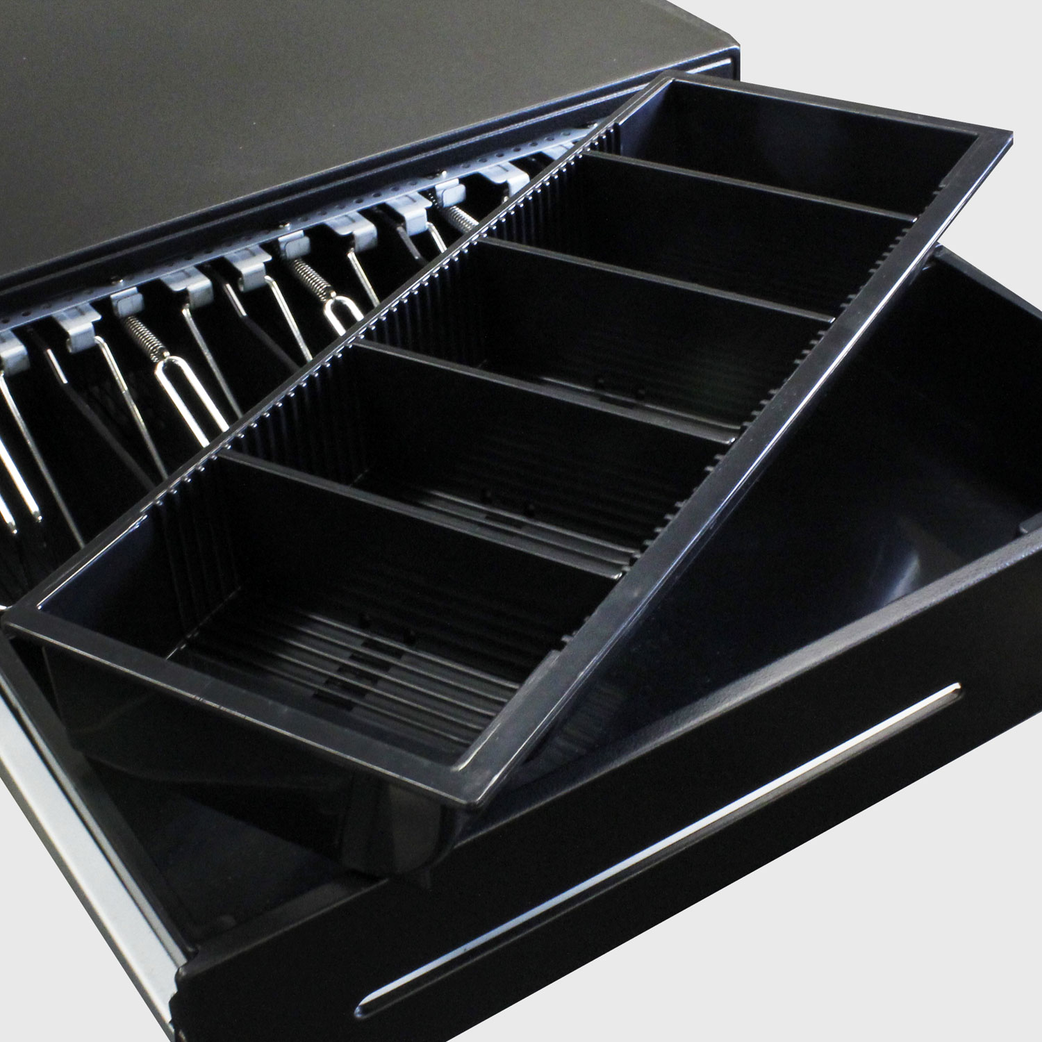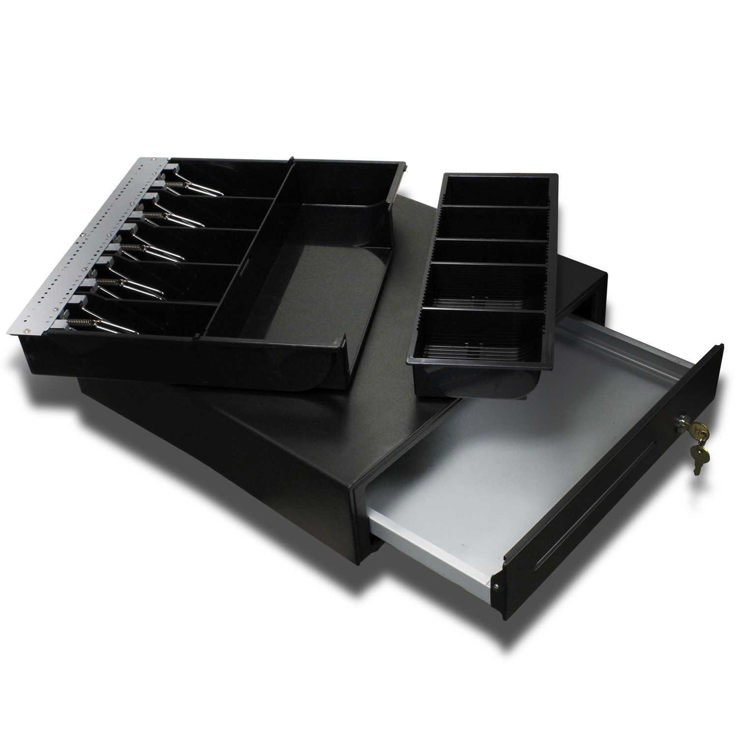 Each cash drawer comes with two coded keys. The 3-position lock latch features three functions: Lock the drawer, Unlock the drawer, and Online (ability to open electronically using a POS terminal without the key)