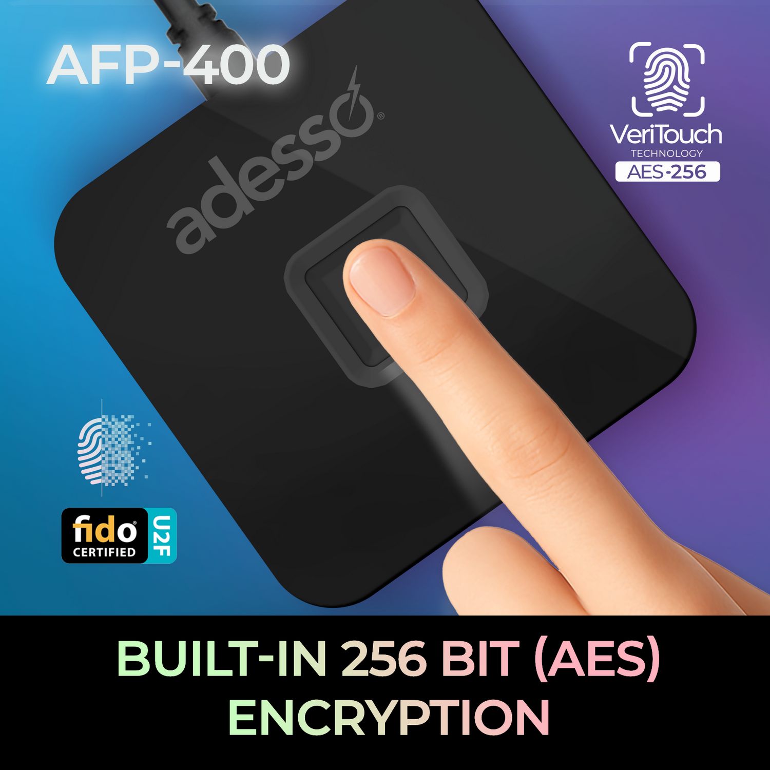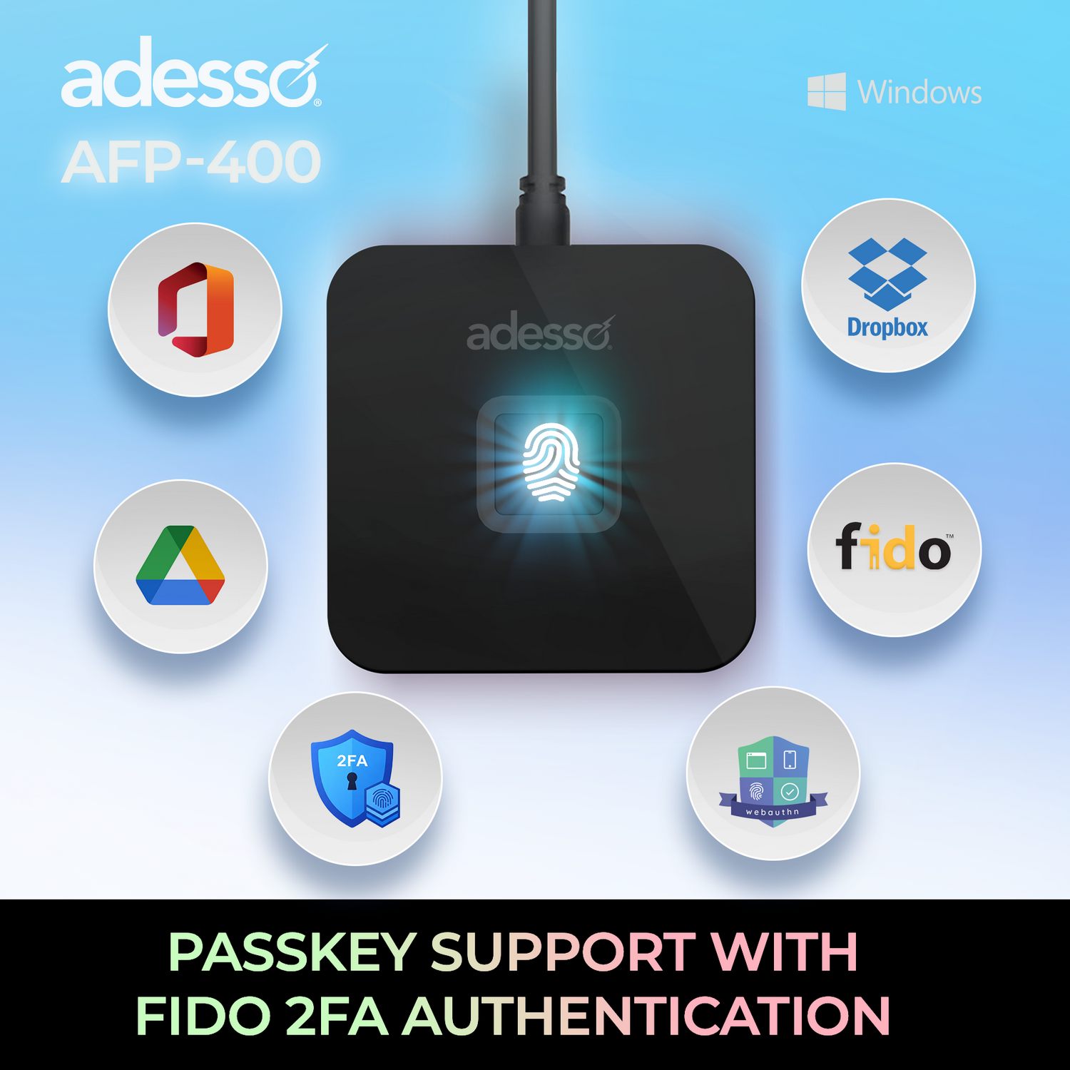 | One Touch Security The Adesso AFP-400 revolutionizes secure access by bringing fast and reliable biometric fingerprint authentication directly to your laptop or desktop. It supports multiple authentication protocols, making it ideal for efficient and instant user verification on any Windows laptop or desktop computer. |