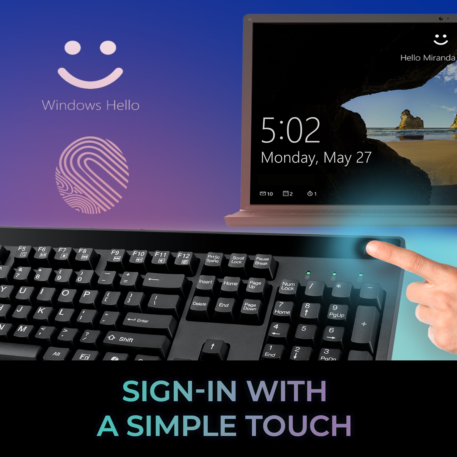 Windows Hello Compatible The Easytouch 1300FB has fingerprint recognition capabilities to allow for secure and fast access to your devices. Gain quick access through Windows Hello by scanning your fingerprint through a stored database. |