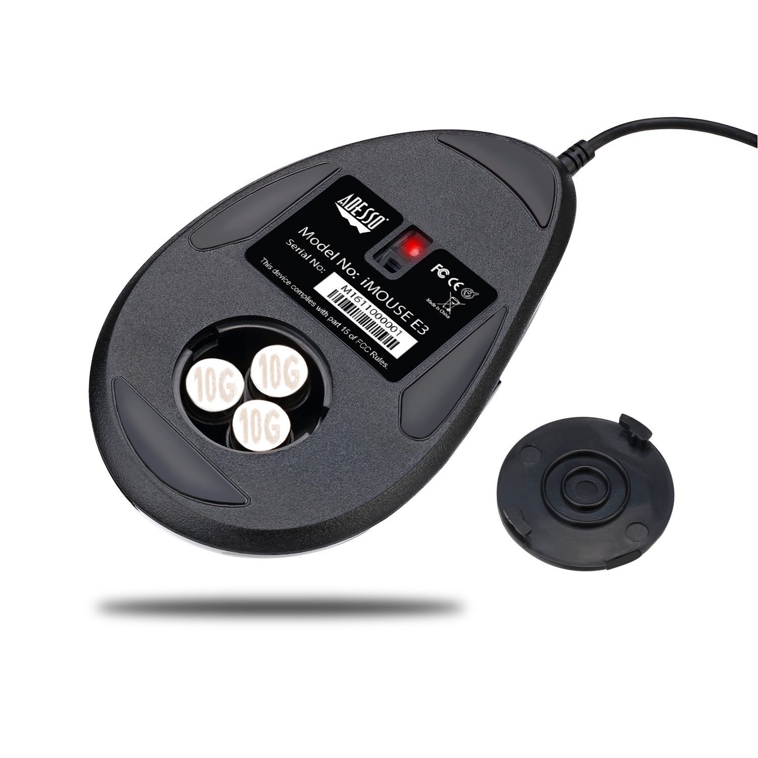 The Adesso iMouse E3 is a right-handed vertical ergonomic wired mouse designed for comfort during long use. It features 6 buttons—including back/forward and DPI switch—an adjustable multi-color LED lighting system, and a set of removable weights so you can tune its heft to your preference. With an optical sensor offering a DPI range up to 6400, this mouse balances precision and ergonomic design to help reduce wrist strain without compromising functionality.
