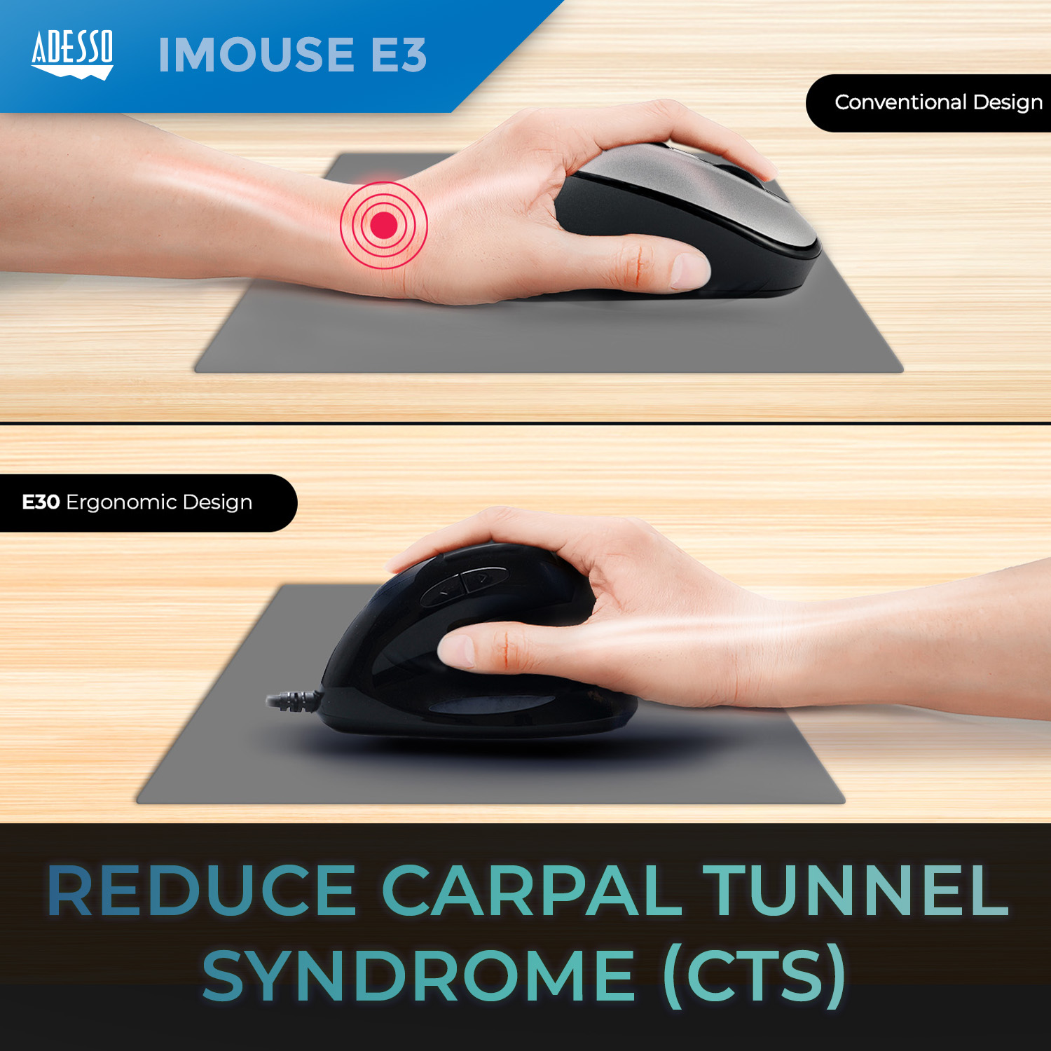 | Reduces Carpal Tunnel Syndrome (CTS) The wrist-friendly contour of the Adesso vertical mice allows you to hold your hand in a neutral “handshake position”, minimizing your forearm muscles from twisting and the possible development of Carpal Tunnel Syndrome. Normally, your forearm muscles are twisted from sitting flat on the supporting surface when using a regular mouse. This “flat position” causes strains on your muscles and leads to wrist pains. This is where the Adesso Vertical Mice become helpful and provide alleviation. |