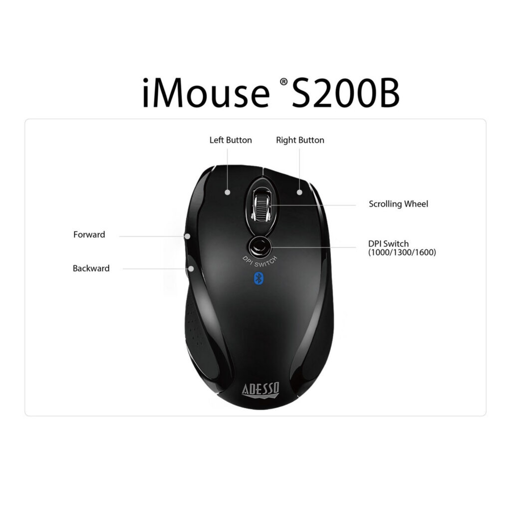 Experience new levels of productivity with the Adesso iMouse S200 Bluetooth Ergo Mini Mouse. This advanced Bluetooth mouse offers you 30 feet of wireless freedom and eliminates the contraints wired mice often cause. Its optical sensor tracking method lets you work on any surface with better speed and accuracy. In addition, the mouse includes three distinct levels of DPI resolution (1000/ 1500/ 2000) for precise targeting (1000 DPI), quick response (1500 DPI) or fast maneuvers (2000 DPI). Easily switch between these DPI resolutions with the DPI Switch button located on the top of the mouse. All these features, along with its ergonomic design, provide great control, response and comfort with minimal hand movement.