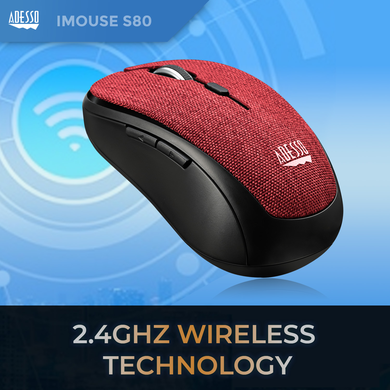 The Adesso iMouse S80 is a wireless fabric-surfaced mini optical mouse designed for both right- and left-handed users. It connects via a 2.4 GHz USB receiver with up to 30 feet (≈10 meters) of range, offers three adjustable DPI settings (800 / 1200 / 1600) for different precision needs, and includes extra buttons (forward, back) along with a scroll wheel. Its soft tweed fabric top gives it a stylish look and a comfortable grip, making it great for travel or minimalist desktop setups.