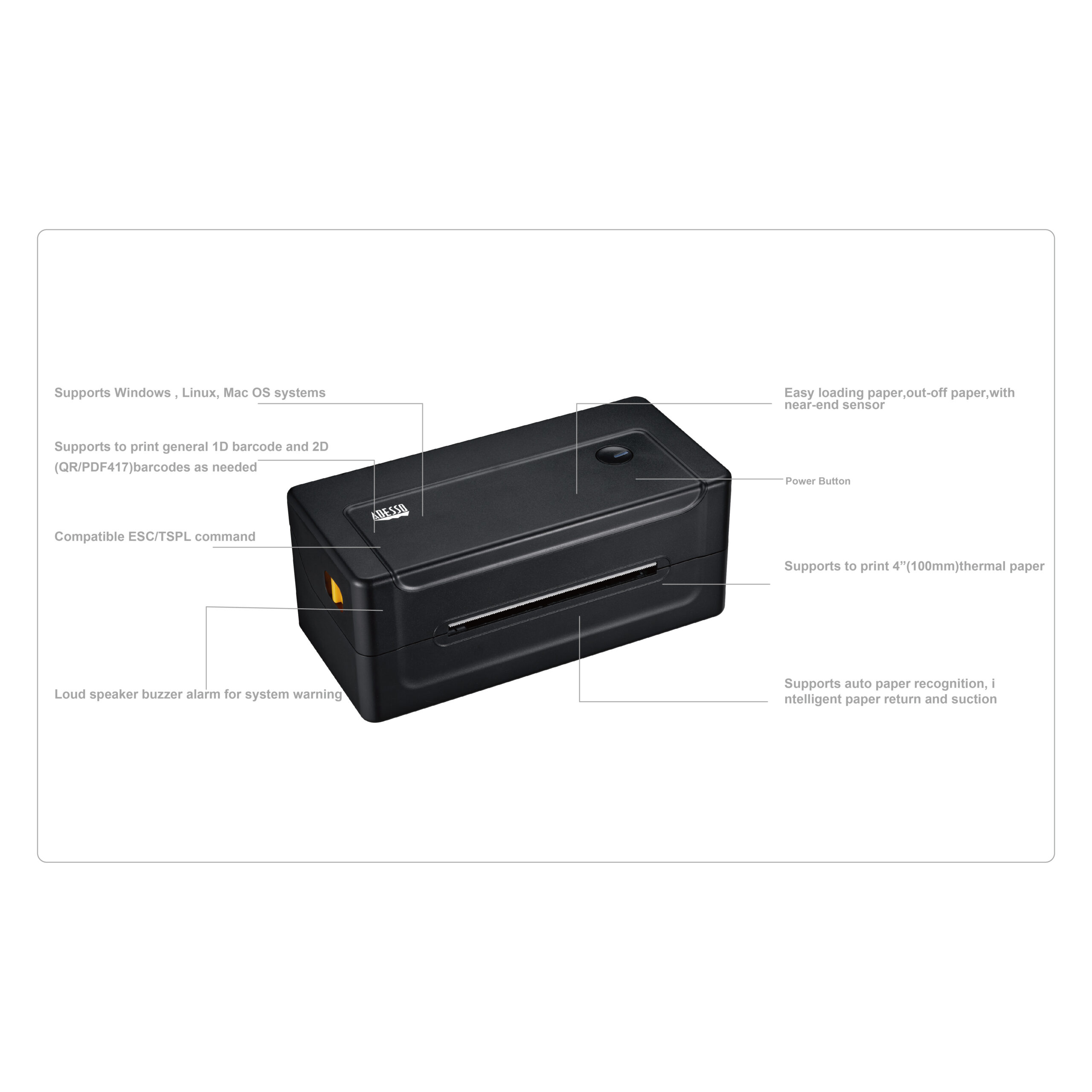 | Supported Paper: | Label, continuous, black label, stacked paper |