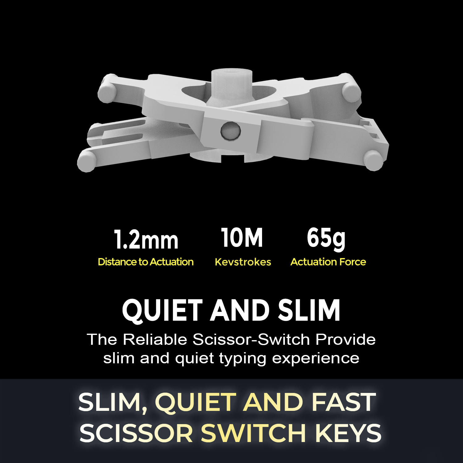Slim, Quiet and Fast Scissor Switch Keys The scissor-switch keys not only offer a faster, quieter and more responsive typing experience, but also provides comfort, speed and better tactile feel. |