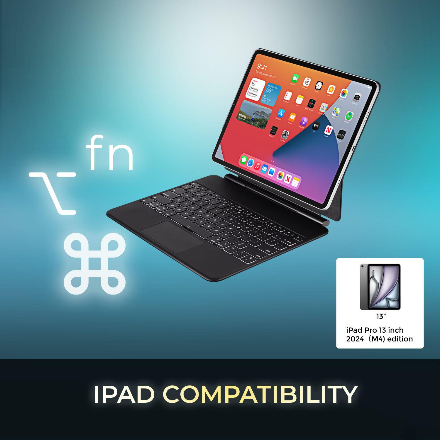 Simply designed for convenience and utility, the aluminum Bluetooth keyboard combined with a cover that converts into a stand holding the IPAD Pro 13inch 2024 (M4) Edition. Turn your mobile device into a mobile workstation wherever you are. The slim case magnetically secures and protects the tablet and keyboard when traveling. The low profile scissor-switch keys provide a tactile response for faster typing. At only 6mm thick, the lightweight yet sturdy aluminum keyboard works equally well on the road or in your home office.