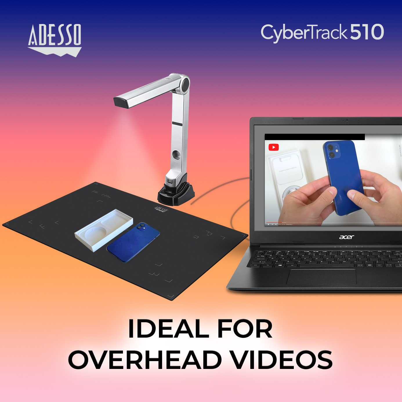 Classroom and Conference Room Presentation The Adesso Cybertrack 510 makes repetitive image capturing, demonstrations, tutorials and lectures comfortable and simple and makes classroom and office presentation experiences seamless.5.0 Megapixel CMOS Sensor With the 5.0 MP CMOS Sensor and fixed-focus down-facing lens, the document camera is capable of capturing images, real-time images of 3D Objects, magazines, books, documents, pictures and business cards and present them through a monitor or projector.Powerful OCR Text Recognition The Adesso Cybertrack 510 document camera is the ideal tool for presentations, image capturing using it’s advanced text recognition.Fixed Focus with Digital Zoom The unique down-facing lens makes repetitive image capturing, demonstrations, tutorials and lectures comfortable and simple with it’s clear image.Video RecordingRecord videos of just about anything, edit images and videos with the advanced editing tools, plus enjoy the convenience of sharing. Photo Capture The unique down-facing lens makes repetitive image capturing comfortable and simple.
