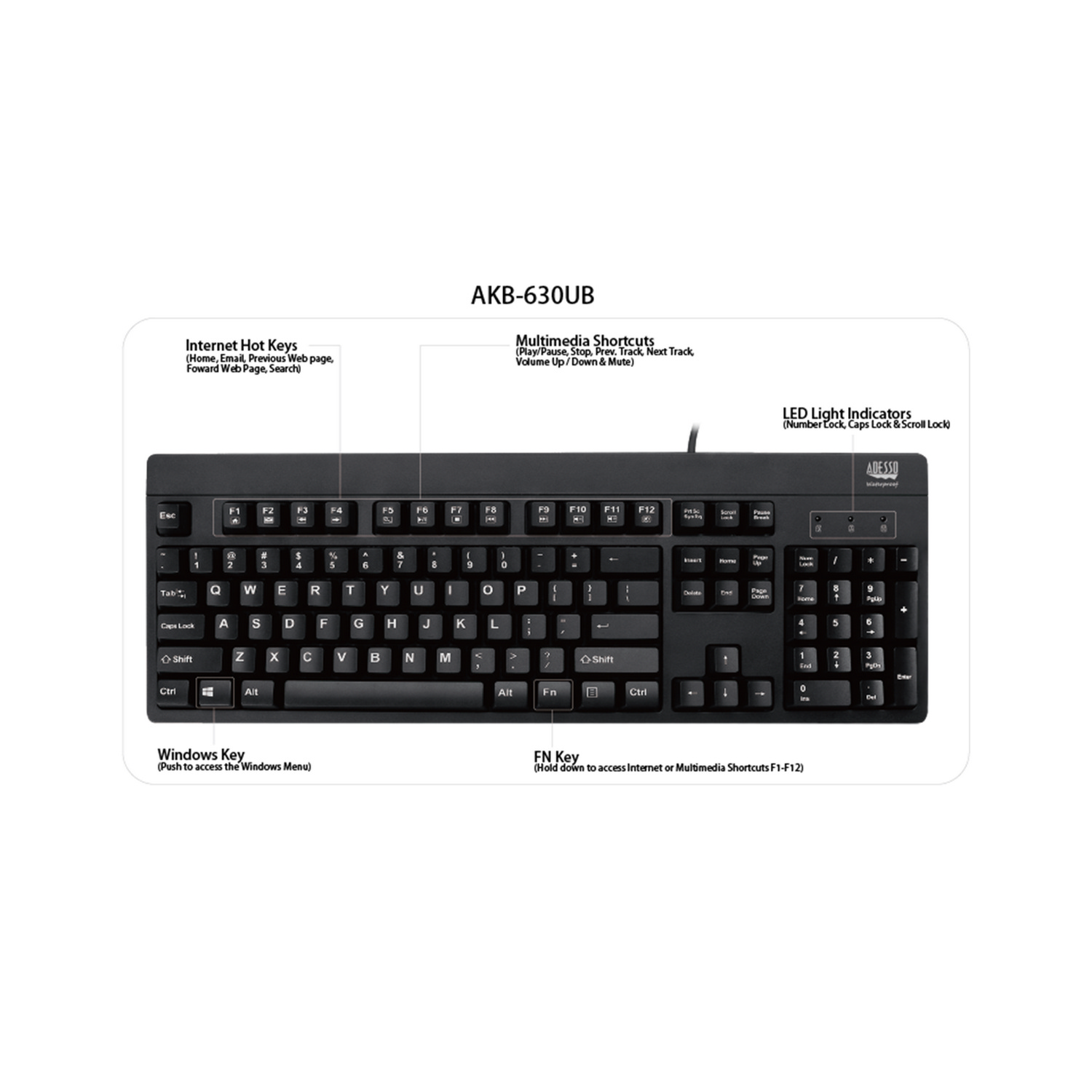 The Adesso® AKB-630UB antimicrobial waterproof desktop keyboard is the perfect keyboard for users looking for a solid keyboard that will work in an environment potentially exposed to liquids, moisture, dust or germ, such as School, Restaurant, Bank, Medical Clinic, Office, POS, Industry and warehouse environment. This keyboard also features membrane keys switch for increased productivity along with multi-functional hotkeys that give you quick access to your internet and media player tools. (Solution: Health)