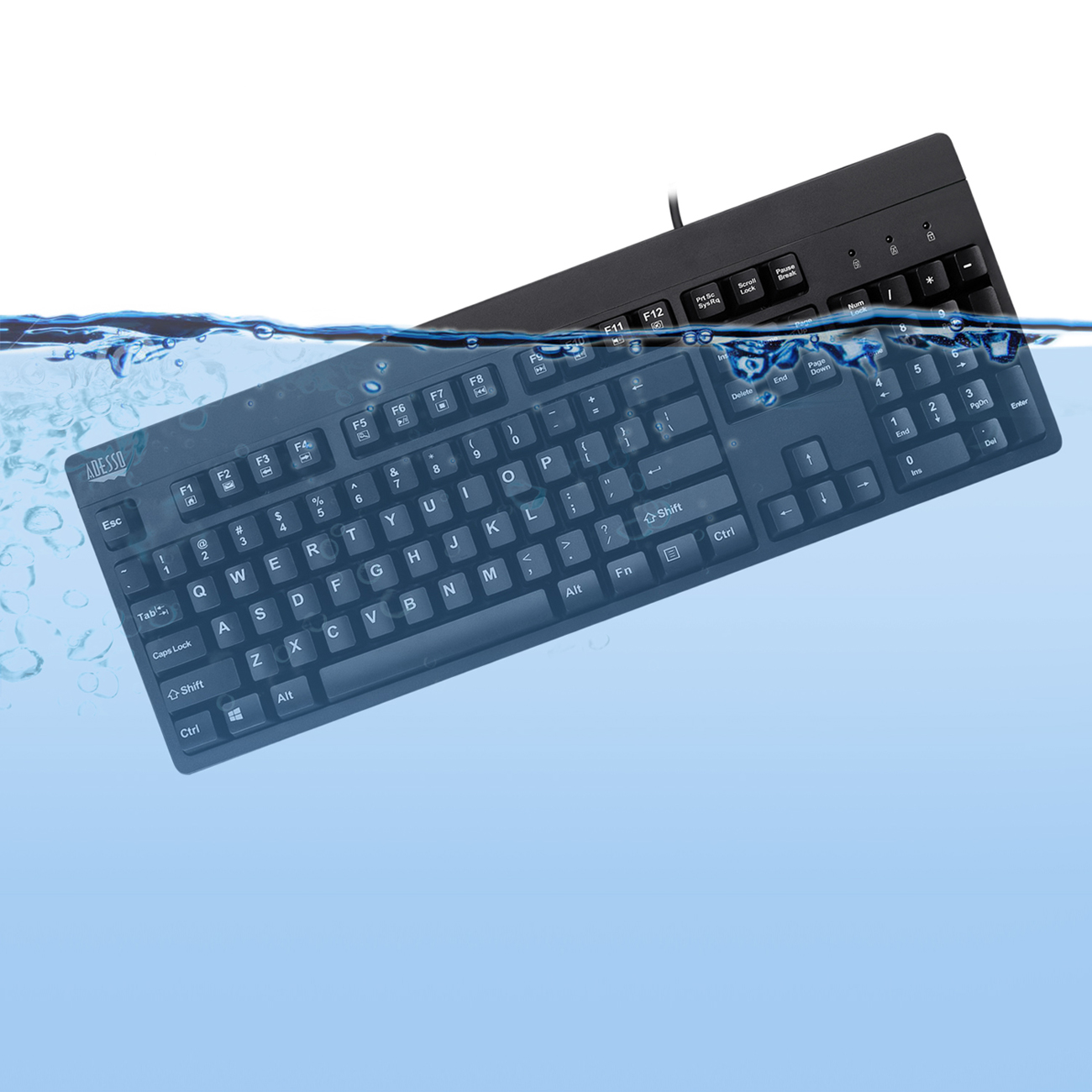 | IP67 Waterproof IP67 Rated. Since the circuit board inside is sealed with a plastic material, this Adesso Antimicrobial Waterproof Keyboard is 100% waterproof and can be cleaned with soap and water or other liquids cleaners. Ranked as an IP-67 Waterproof Standard, this device can withstand being submerged in water for up to 30 min up to a 3 ft depth. |