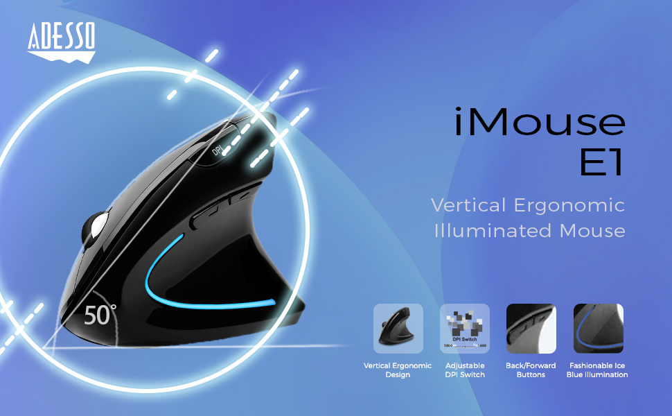 The Adesso iMouse E1 is a game-changing USB-A vertical ergonomic mouse designed to revolutionize your computing experience. With its innovative vertical orientation, this mouse promotes a natural handshake position, reducing wrist strain and discomfort during extended computer use.