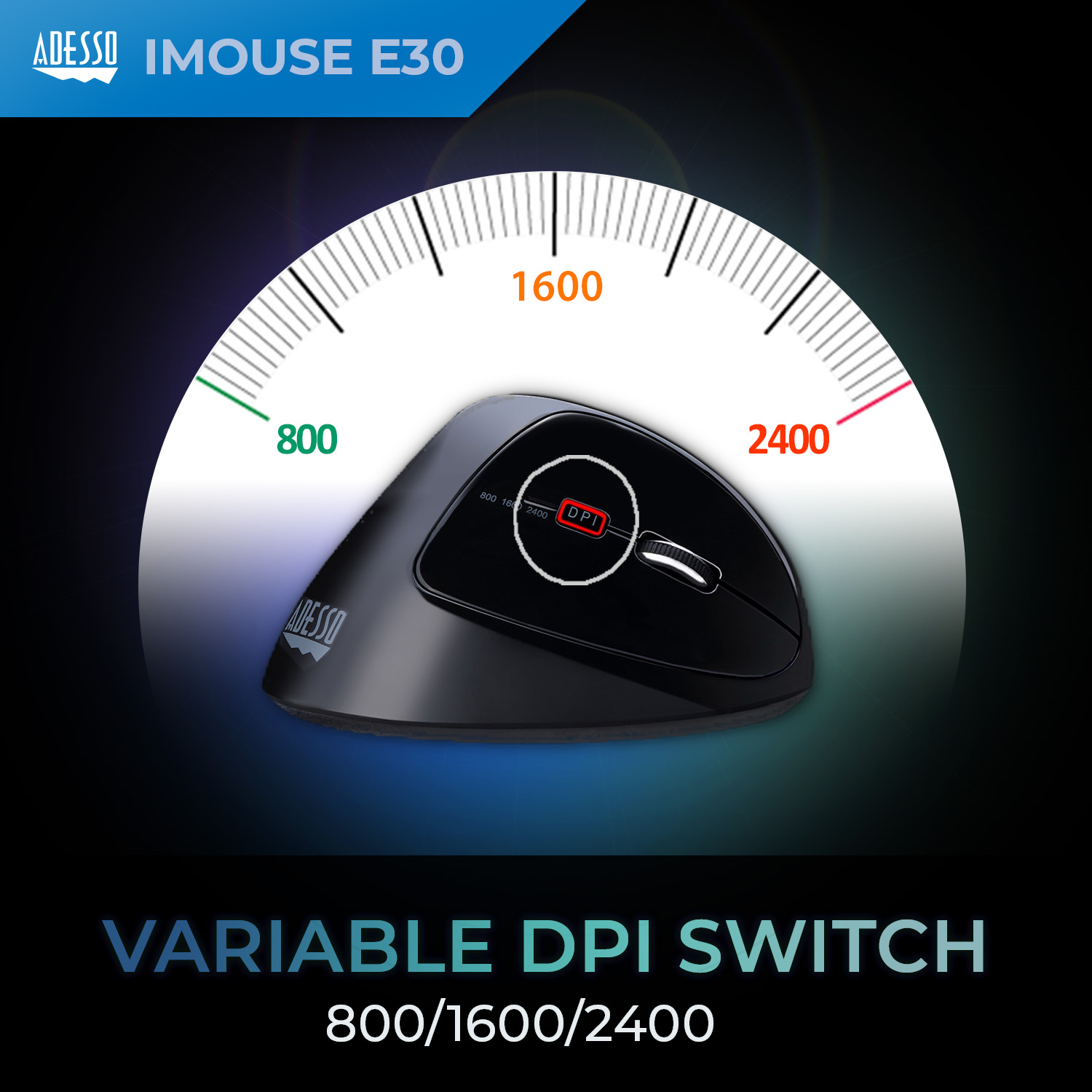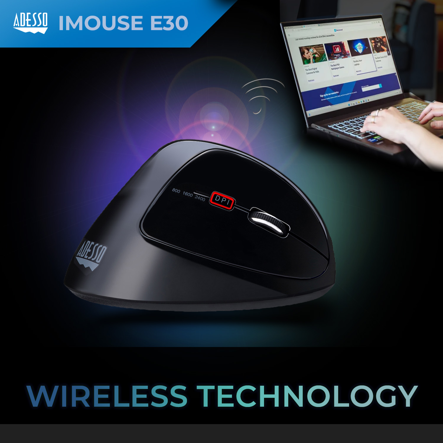 2.4 GHz Wireless Vertical Programmable Mouse With 2.4 GHz Radio Frequency technology, the Adesso® iMouse™ E30 Wireless Vertical Righthanded Ergonomic Mouse provides you with wireless convenience and the freedom of a smooth connection for up to a 30-foot range without tangled cables. This ergonomic mouse is designed with a vertical orientation and a contoured shape that provides a uniquely comfortable user experience. With this wrist-friendly contour support, you will hold your hand in a healthy “handshake position” which is the neutral position of your forearm as opposed to the “twisted forearm” position as with a regular mouse. Two internet buttons are conveniently located on the side of the mouse for Back and Forward page browsing. The switchable DPI button on the top provides multiple levels of mouse cursor speed that is useful in different environments. The advanced Optical Sensor technology keeps the mouse precisely on point and lets you work on most glass, wood, marble, and leather surfaces without a need of a mouse pad. Finally, the iMouse E30 is Plug and Play and requires no drivers. Simply plug the USB Receiver into any available USB port and be ready to enjoy the freedom of a comfortable and wireless mouse experience! 2.4 GHz RF Wireless Technology with On/Off Switch This mouse works at any angle with a range of up to 30 ft. with no wires to get tangled. The On/Off switch helps conserve battery power plus the low battery indicator helps you know when it is time to change batteries. Programmable Driver Adjust and customize your iMouse E30 to your liking to enhance your gaming experience with the included Programmable Driver. Easy to install, and navigate through, within the driver menu, adjust anything from mouse colors, to blinking speed, to assigning commands (macros) , extending your DPI speed up to 4800 DPI, and reprogramming buttons with a few simple steps. Ergonomic Vertical Design Our vertical ergonomic design helps you achieve a more natural grip, better support, and natural wrist position. With our sleek design and added support, the Adesso Vertical Ergonomic iMouse E30 is perfect for long hours of use. Adjustable 3 Level DPI Switch (800 / 1600 / 2400) Attain higher precision and better accuracy with your choice of 3 DPI levels. Easily switch from three different DPI levels which change color depending on the level chosen. From 800 (green),1600 (blue) and 2400 (red) the easily-accessible DPI button lets you quickly switch between the various computer tasks you partake throughout the day. Reduces Carpal Tunnel Syndrome (CTS) The wrist-friendly contour of the Adesso vertical mice allows you to hold your hand in a neutral “handshake position”, minimizing your forearm muscles from twisting and the possible development of Carpal Tunnel Syndrome. Normally, your forearm muscles are twisted from sitting flat on the supporting surface when using a regular mouse. This “flat position” causes strains on your muscles and leads to wrist pains. This is where the Adesso Vertical Mice become helpful and provide alleviation.
