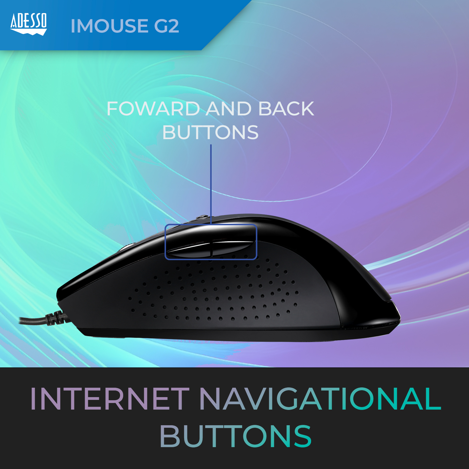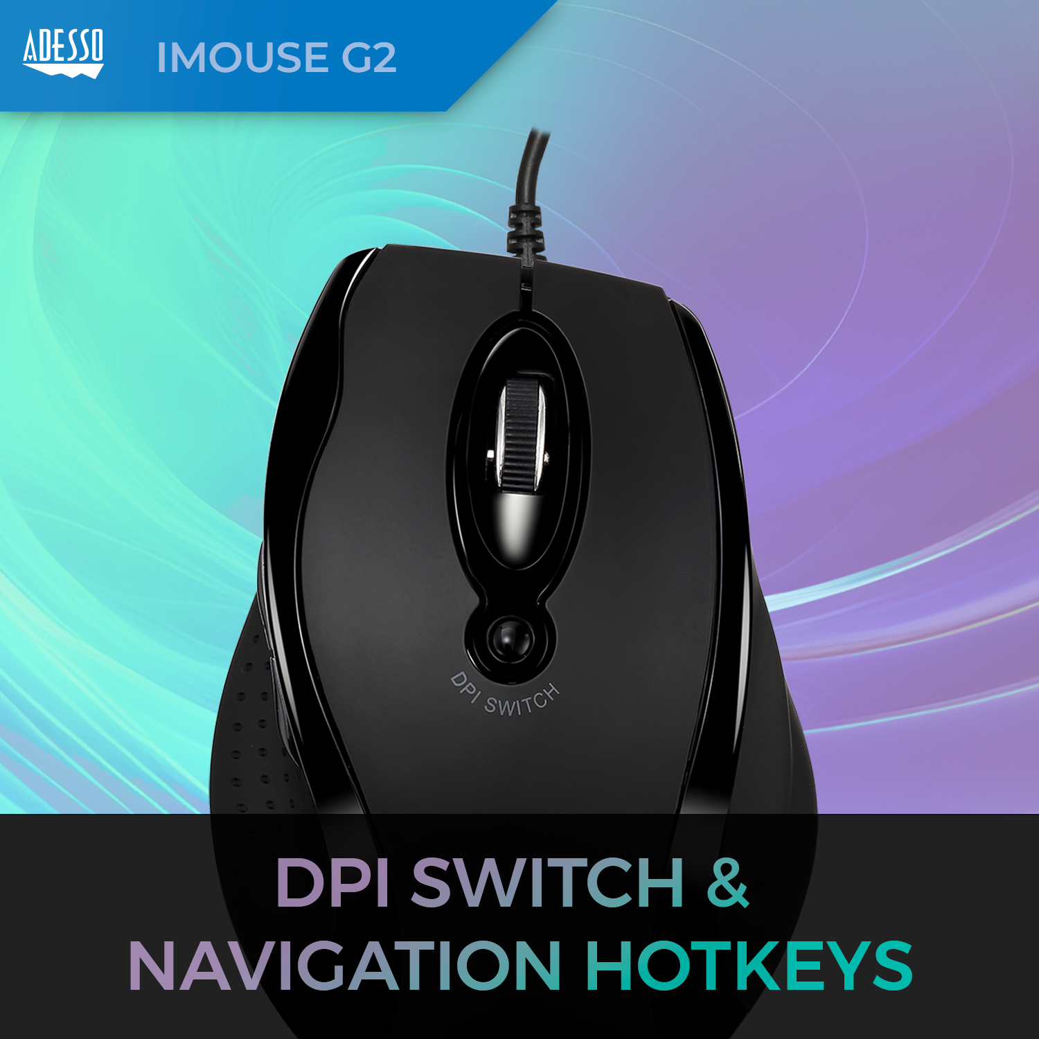 Experience new levels of productivity with the Adesso iMouse™ G2 -Ergonomic Optical Mouse. Its advanced optical sensor tracking method lets you work on most surfaces with better speed and accuracy. Easily switch between these DPI resolutions with the DPI Switch button located on the top of mouse. It also equips with two internet navigation buttons and a DPI switch for adjusting different resolutions (800/1200/1600/2400). All these features, along with its ergonomic design, provide great control, response and comfort with minimal hand movement.