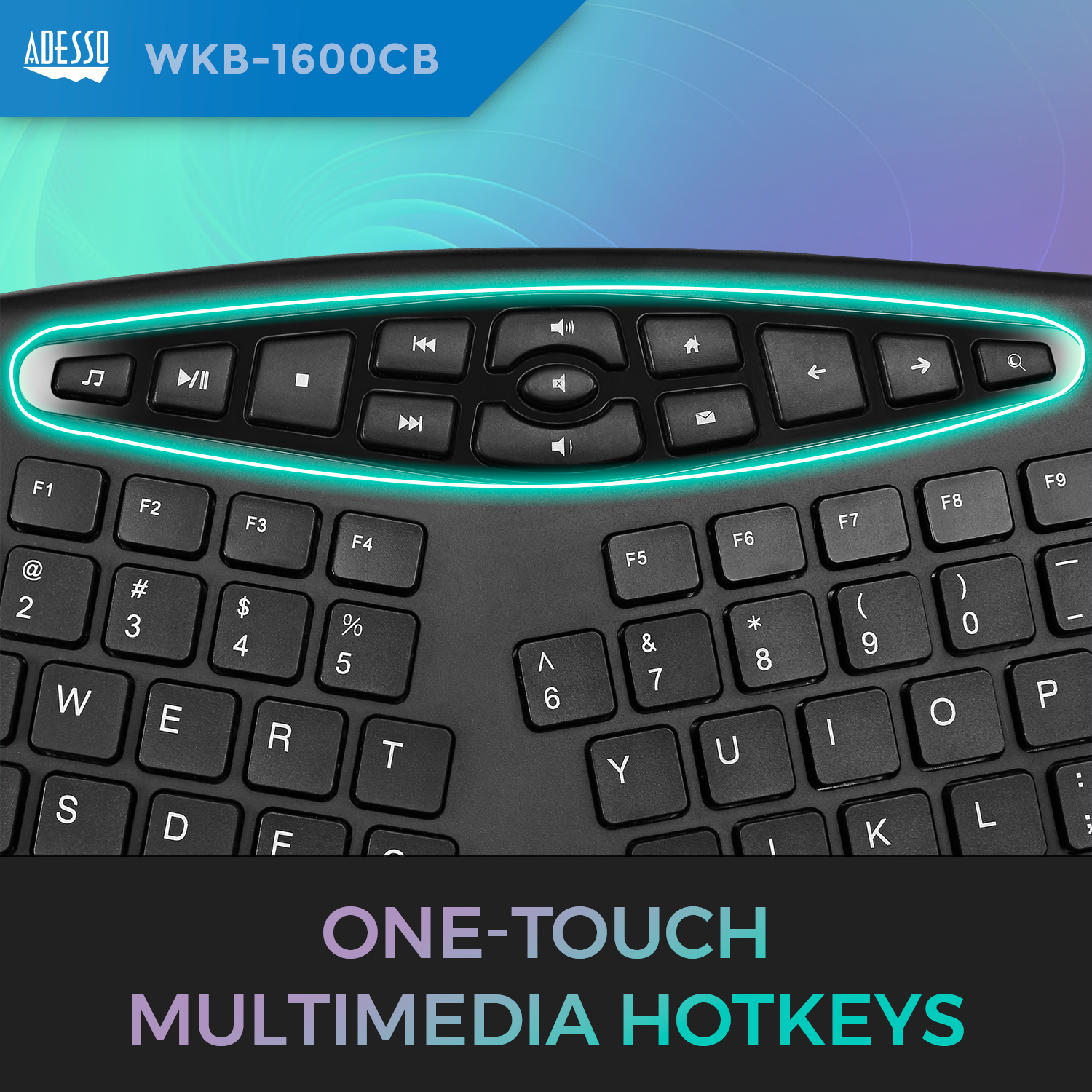 The Adesso Wireless Ergonomic Keyboard & Optical Mouse offer users two advanced input devices with ergonomic design, multifunctional features and a wireless range of up to 30 feet. The design of this keyboard with splitted key zones and gently sloped encourages natural position of hands, wrists, and forearm in maximum comfort for long use. The new chiclet keycap with its larger keycap surface makes typing easier and blends in with the keyboard to make a stylish design. The included wireless optical mouse not just provides comfortable ergonomic design but also equips with a DPI switch for changing resolution (800/1200/1600) and two Internet navigation buttons.