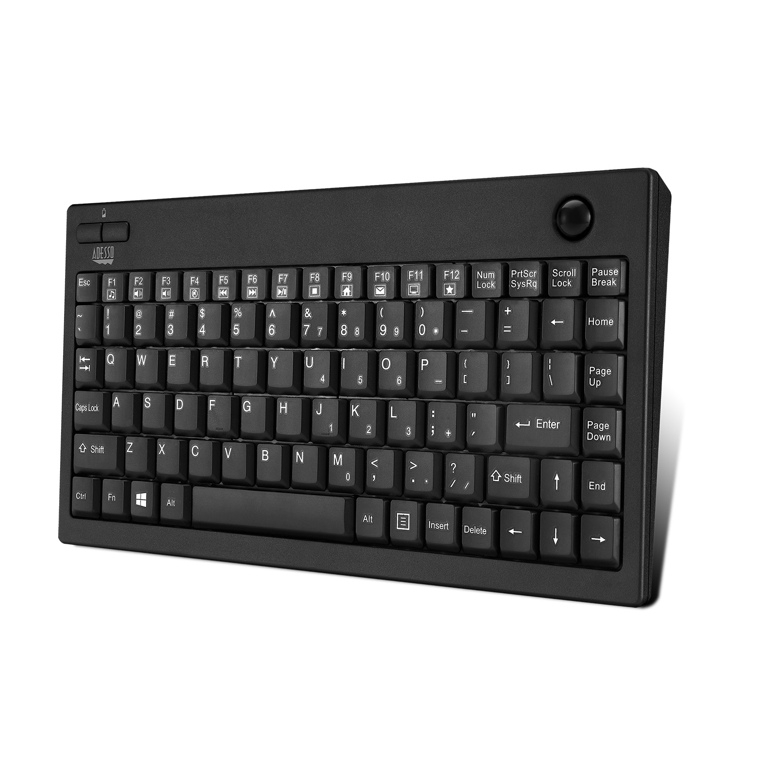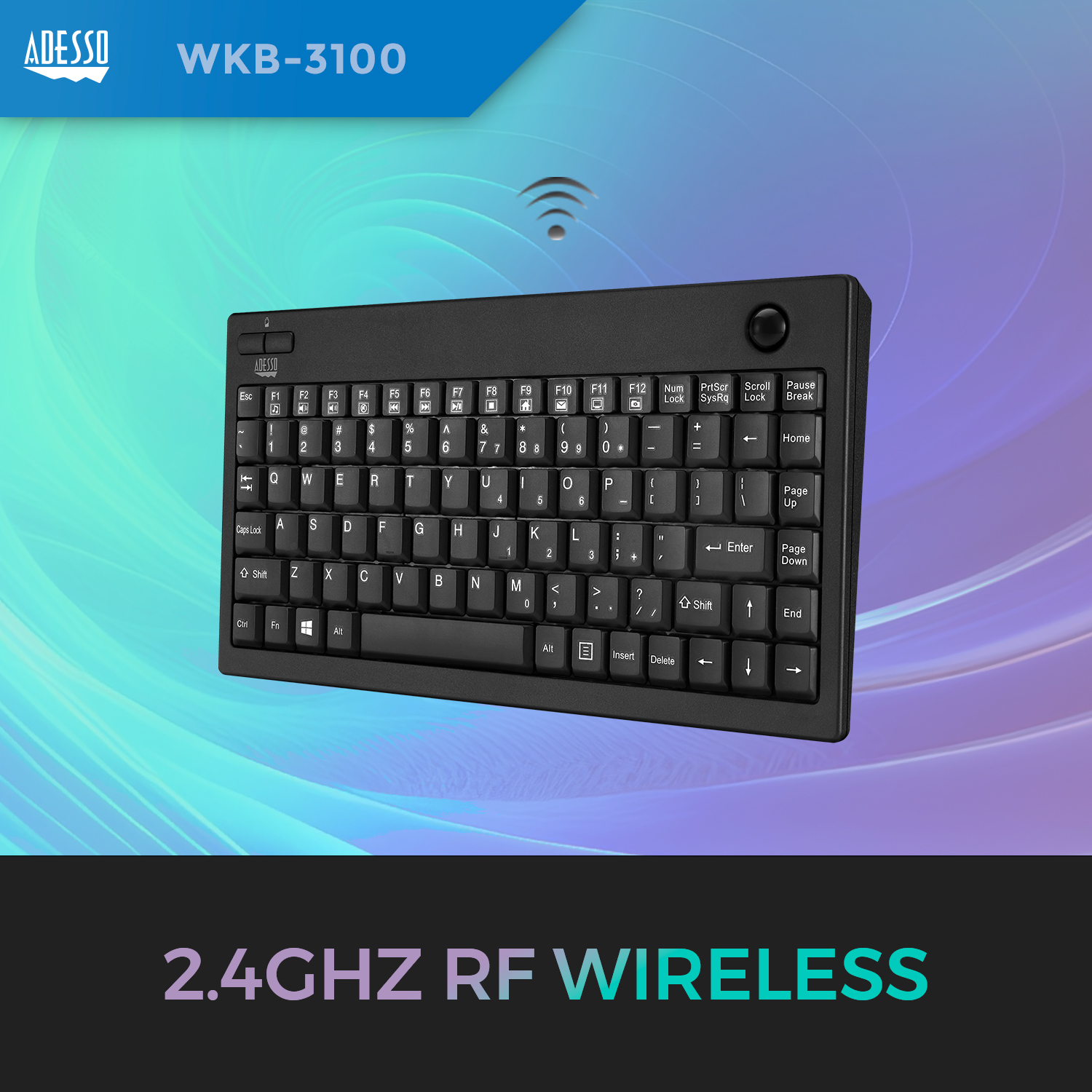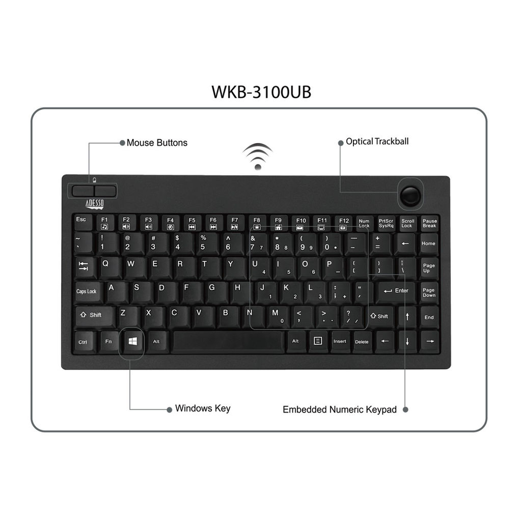 The Adesso Wireless 2.4 GHz RF Mini Trackball Keyboard combines the control of an integrated trackball with the features of a standard keyboard. Users can work freely with no space or distance restraints. It has 6500 IDs on 12 channels, allowing users to enjoy 30 feet of wireless freedom. The trackball delivers superior precision and smooth motion with virtually no maintenance or cleaning required. This mini keyboard is perfect for compact spaces, including the living room, kiosks/stations, conference rooms, mobile and workgroup project environments. This unique keyboard fits brilliantly with modern PC systems, flat LCD monitors and Tablet PC’s in modern office environments. Its small, compact size is also extremely mobile, fitting easily in a briefcase or backpack.