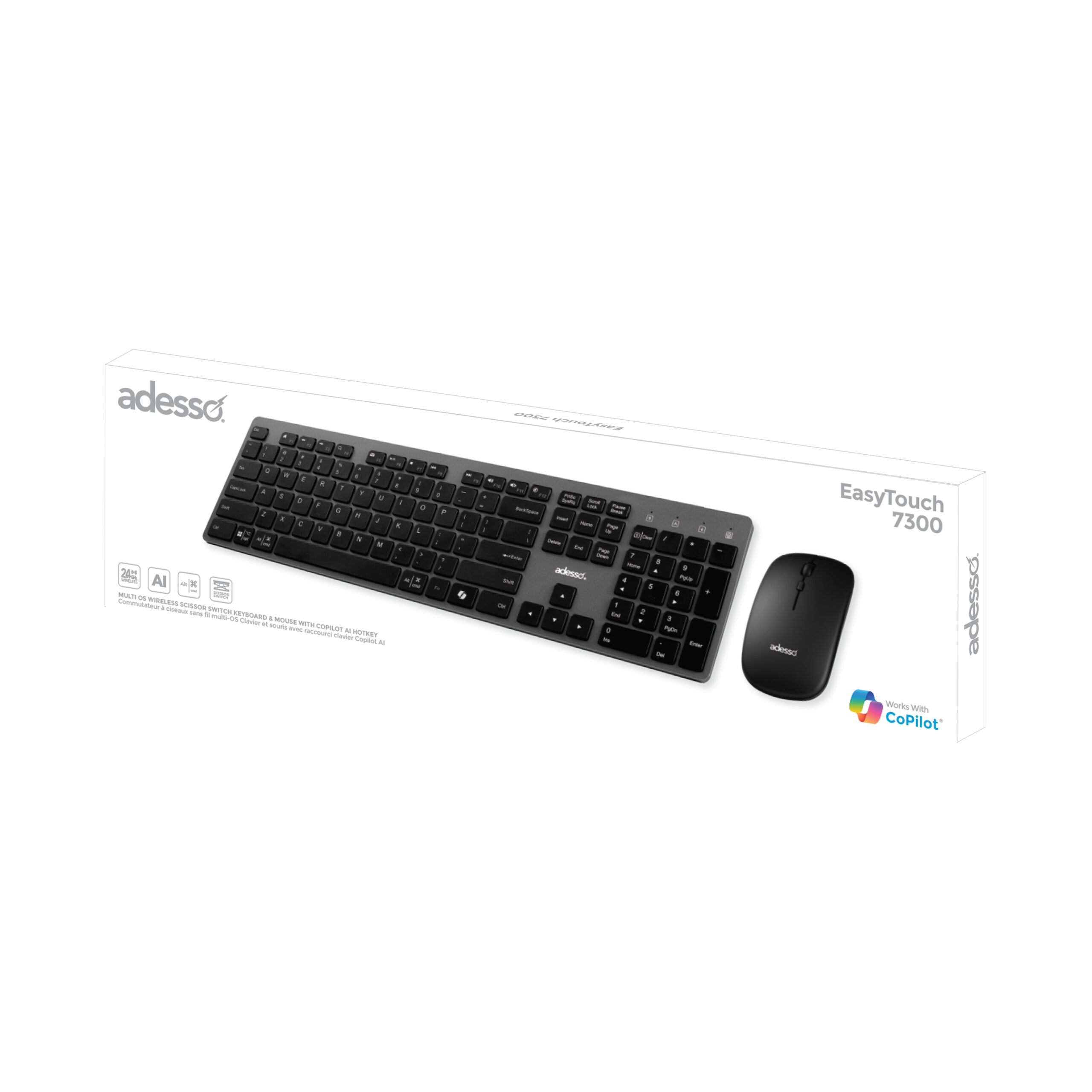 The Adesso WKB-7300CB is a 2.4GHz RF wireless keyboard and mouse combo featuring responsive scissor-switch keys for smooth, quiet typing and a precision wireless mouse for reliable navigation. Perfect for home or office, this combo delivers comfort, convenience, and dependable performance without the clutter of cables.