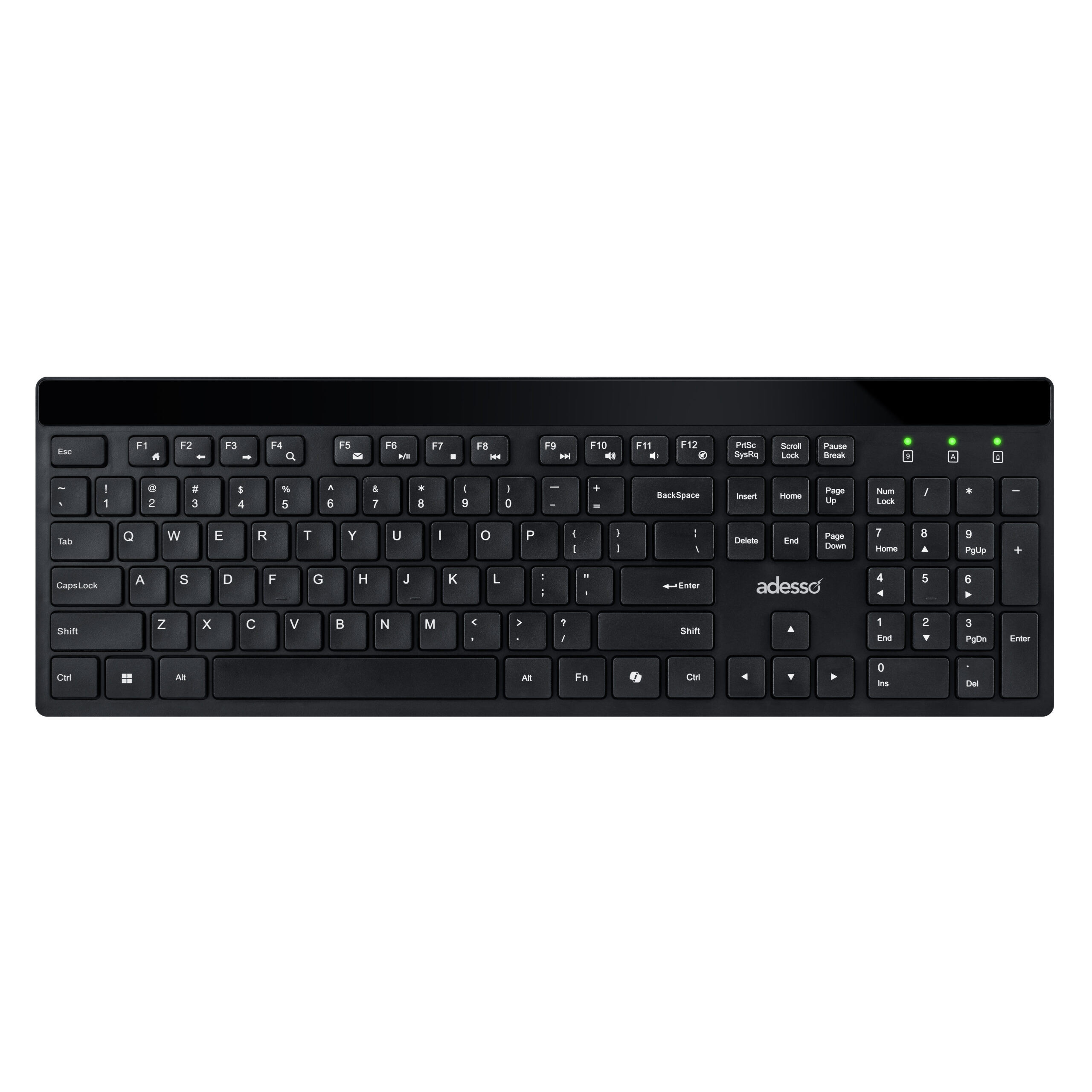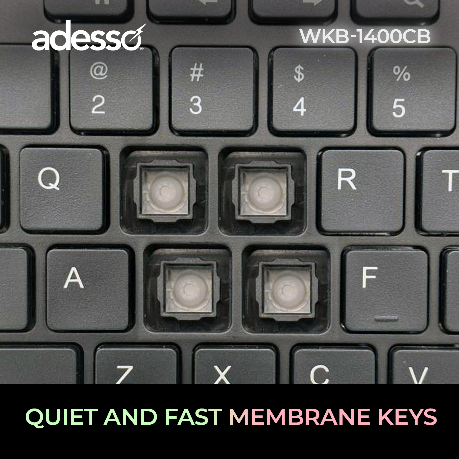 Quiet Membrane SwitchThe Adesso WKB-1400CB features quiet low-profile switches designed for a smooth, soft keystroke that minimizes typing noise. Perfect for shared workspaces, these switches deliver a comfortable and responsive typing experience without distractions. |