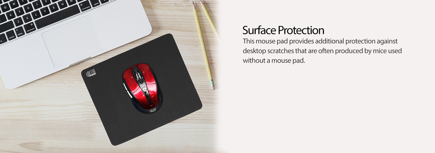 This mouse pad provides additional protection against desktop scratches that are often produced by mice used without a mouse pad. |